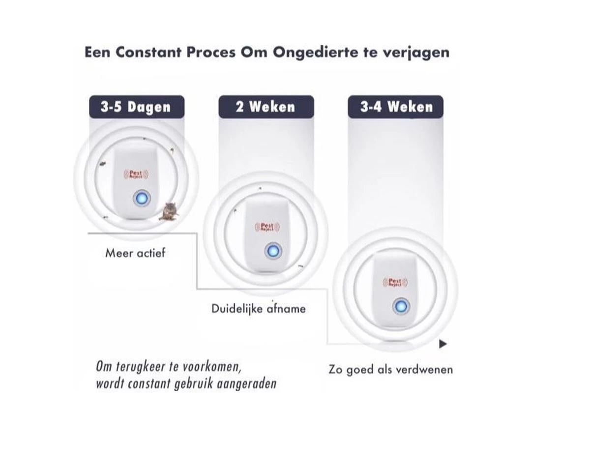 Door de ultrasone werking heeft de ongedierte bestrijding meestal 3-4 weken nodig voordat het Ultrasoon reject effect werkt: