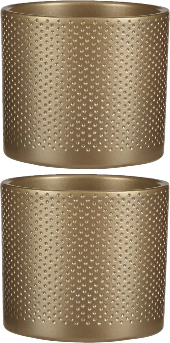 2x stuks bloempot in de kleur relief goud gemaakt van keramiek voor een kamerplant – H12.5 x D13.5 cm. Deze ronde bloempot uit de Era serie met mooie relief afwerking is een bloempot/plantenpot basic voor in elke huiskamer. Gemaakt van terracotta/keramiek. Binnen gebruik. Diameter: 13.5 cm. Hoogte: 12.5 cm.