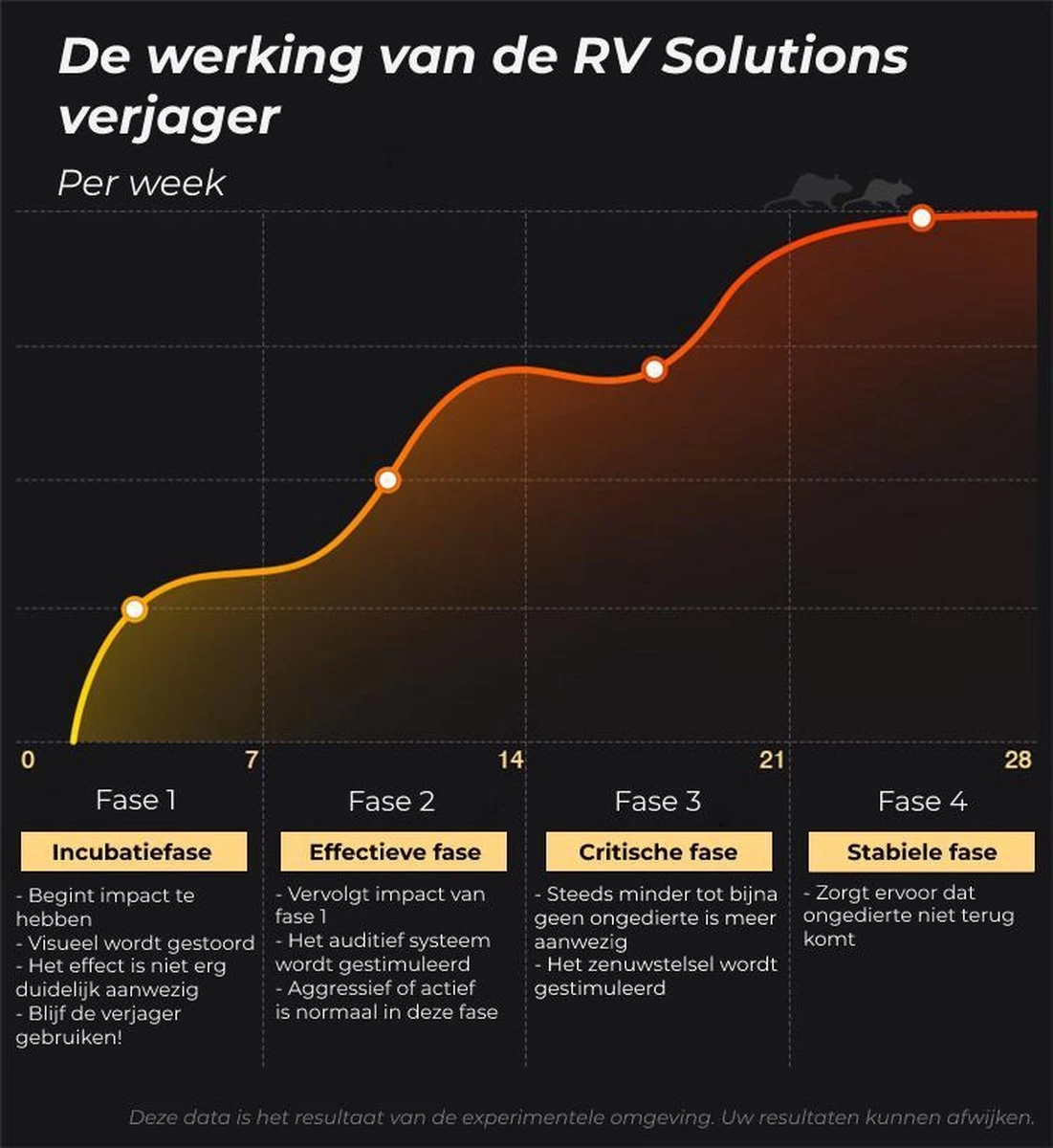 De marterverjager is veilig voor mens en dier. De marterverjager zendt namelijk ultrasone uit. Simpel gezegd: geluid op een hele hoge frequentie. Deze hoge frequentie is niet schadelijk. Marters en ander ongedierte kunnen deze hoge frequentie horen, maar het brengt geen schade aan. Omdat de marterverjager van RV Solutions elke 12 seconden een andere frequentie aanneemt, went het ongedierte niet aan de frequentie en blijft hij effectief.