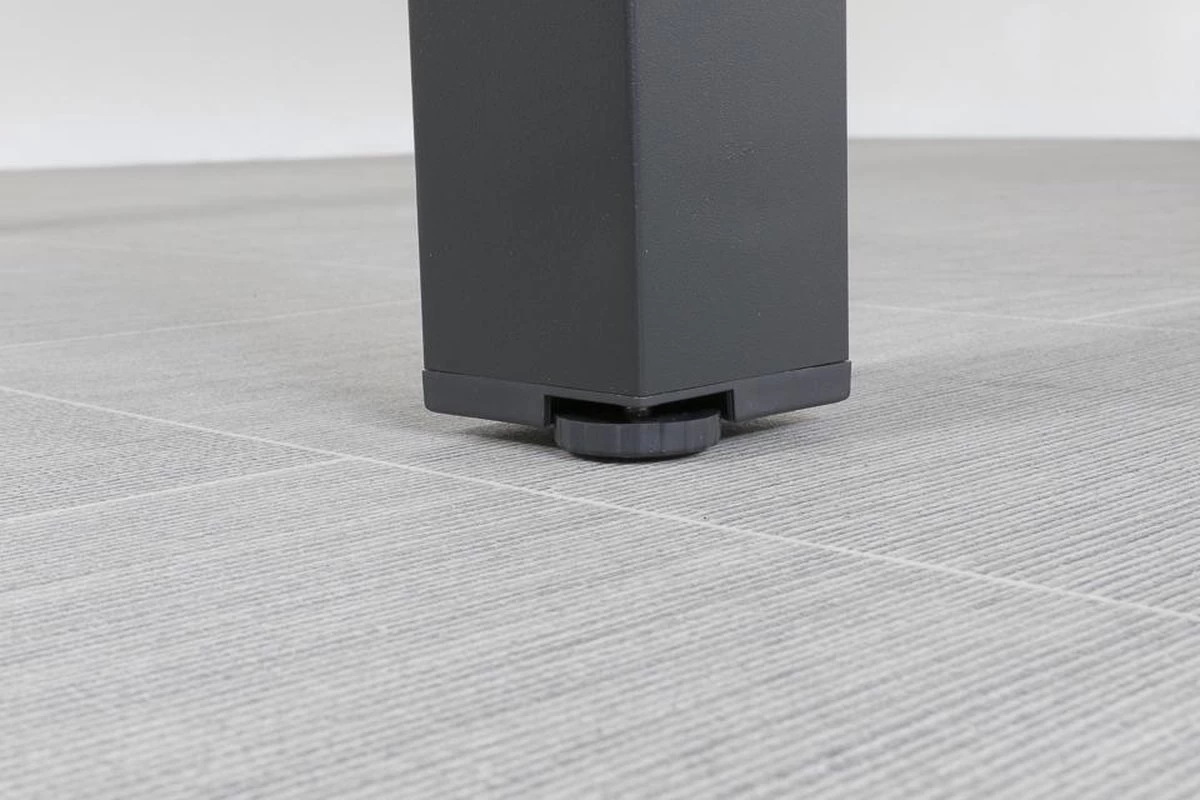 De Alma tuintafel heeft een aluminium frame welke afgewerkt is met een beschermende antracietkleurige poedercoating. Deze coating zorgt ervoor dat het frame kras- en stootvast is. Aluminium is een veelgebruikt materiaalsoort in de tuinmeubelindustrie. Dit materiaal heeft namelijk een lange levensduur, kan niet verroesten en heeft weinig onderhoud nodig. Onder elke tafelpoot zit een verstelbaar dopje zodat je de tuintafel waterpas af kunt stellen. Het tafelblad van de Alma is gemaakt van “spray on glass” veiligheidsglas welke afgewerkt is met een speciale beschermlaag.