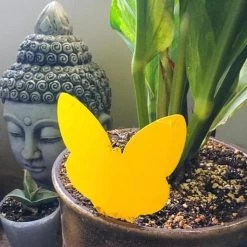 Je ontvangt 10 stuks van deze gele vangplanten in de vorm van een vlinder.