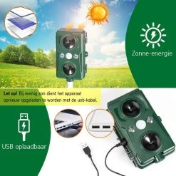 Het apparaat beschikt over een infrarood bewegingssensor die de beweging en lichaamswarmte van een dier dat in de buurt komt waarneemt. Vervolgens geeft het apparaat een geluid, ultrasone golf en/of lichtflits af, wat het dier afschrikt en wegjaagt. Het apparaat heeft meerdere frequenties die u kunt instellen om zelf te bepalen welke diersoorten u uit uw tuin wilt verjagen.