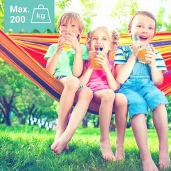 Dubbele Hangmat voor 1 of 2 personen van het merk HomeShopXL Heerlijk vertoeven in eigen tuin! In deze hangmat kom je (samen) tot rust! Bevestig hem tussen 2 bomen, 2 palen of op een hangmatstandaard. De hangmat zit in een handige opbergtas waar ook de bevestigingstouwen in meegeleverd worden. Het is niet nodig om bij elke regenbui de hangmat weg te halen. Hij is weerbestendig zodat u hem gerust kunt laten hangen.