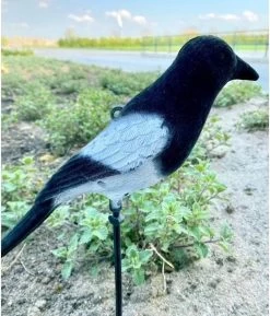 3 x ekster – nep ekster geflock* met grondpin en ophangoog. Een diervriendelijk afschrikmiddel om eksters te verjagen is om een namaak ekster te plaatsen of bijvoorbeeld ondersteboven in een boom te hangen. Een dode soortgenoot schrikt ook af. Echter zullen ze hier waarschijnlijk wel aan wennen, dus het is aan te raden om de ekster zo nu en dan te verplaatsen van plek.