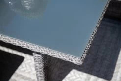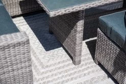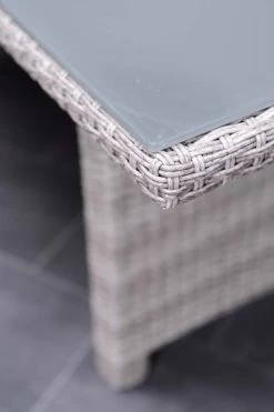 Ben je op zoek naar een comfortabele loungeset om heerlijk in te kunnen ontspannen, maar ook lekker in kunt eten? Met de Jaru lounge dining set hoef je geen moeilijke keuze meer te maken tussen een dining set of een loungeset. Deze mooie en ruime lounge dining set heeft het allebei! Deze set is vervaardigd uit een onderhoudsvrij aluminium met daaromheen weerbestendig wicker in de kleur organic grey, waardoor je het hele jaar kunt genieten van deze mooie lounge dining set. Het wicker is gemaakt van een stevig kunststof waardoor de set zeer duurzaam is. Deze set wordt compleet geleverd met hoogwaardige kwaliteit polyester zit- en rugkussens. De zitkussens zijn bovendien voorzien van een rits, waardoor de hoesjes met de hand gewassen kunnen worden. De kussens zijn niet 100% waterdicht, maar zijn wel voorzien van een waterafstotende coating. Dit is vooral erg praktisch als er bijvoorbeeld op het kussen wordt gemorst met drinken. Je veegt het vocht er namelijk gemakkelijk weer af. Na gebruik kunnen de kussens opgeborgen worden in de schuur of in een kussenbox. De ruime bijpassende lounge dining tafel is voorzien van een mooie geharde glasplaat. Deze lounge diningset bestaat uit twee losse bankdelen, een tafel en twee krukjes. De bankdelen kunnen aan de onderzijde door middel van clips eenvoudig aan elkaar vast worden gezet. Na ontvangst van de set moet alleen één armleuning en het onderstel van de tafel gemonteerd worden, dit is uiteraard eenvoudig zelf te doen. De Jaru lounge dining set is leverbaar in diverse kleurstellingen. De afmetingen van deze setopstelling zijn: L 255 x B 205 x H 85 cm. De tafel is 150 cm lang en 80 cm breed.