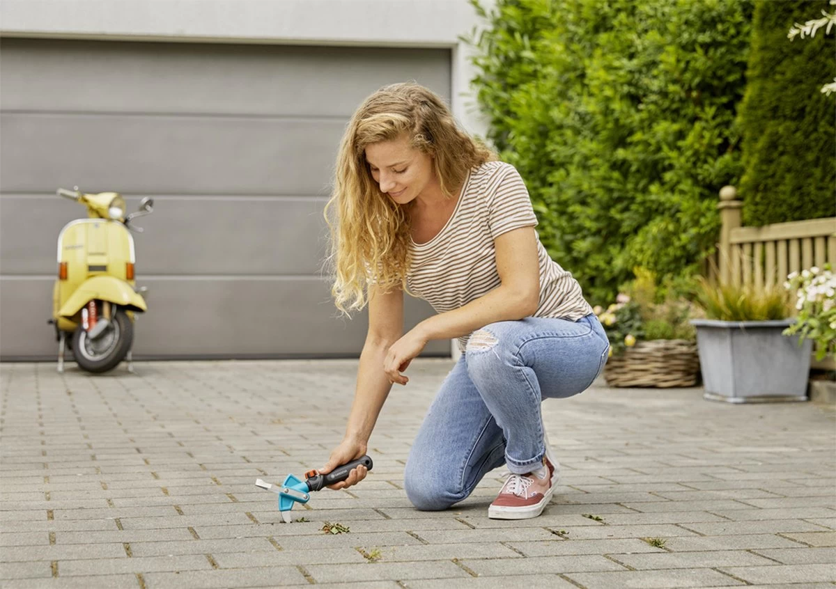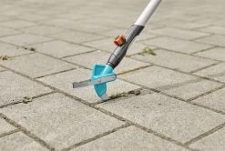 De blauwe 2-in-1 combisysteem voegenkrabber van Gardena is een slim hulpmiddel om onkruid en mos eenvoudig en moeiteloos te verwijderen. Het gereedschap heeft een robuust en dun roestvrijstalen blad, dat is ontworpen voor gebruik tussen nauw aansluitende terrasstenen of -tegels.
