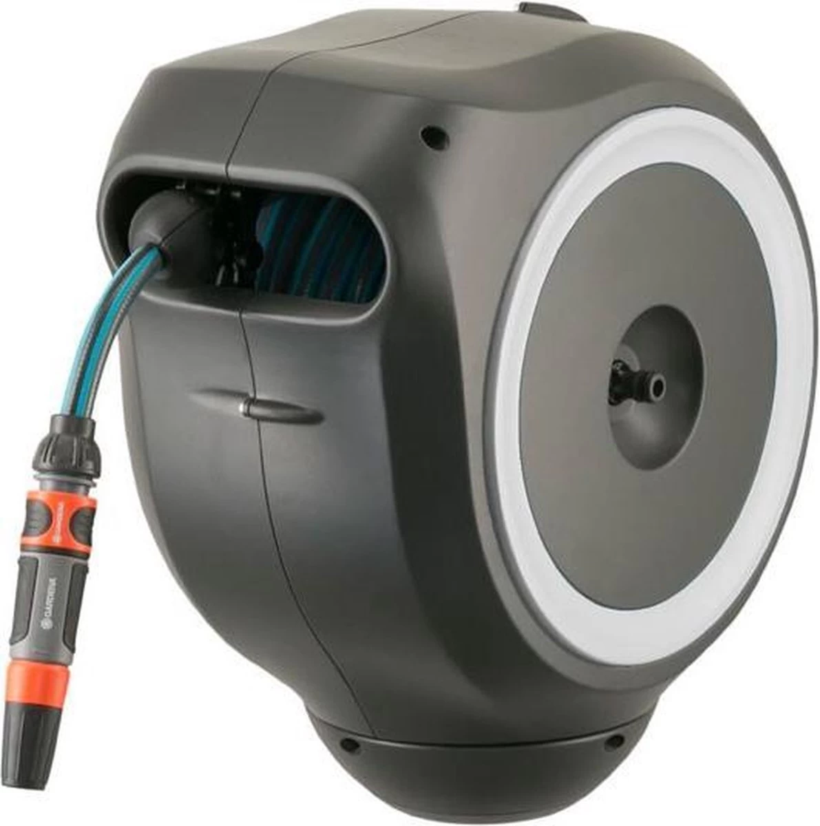 De slangenbox RollUp M voor maximale bewegingsvrijheid bij het bewateren van uw middelgrote tuin Bewatering die altijd gebruiksklaar is: Met de wandslangenbox RollUp M/L is het bewateren van uw tuin een waar genoegen. Deze wandslangenbox bespaart u het moeizame oprollen, uw handen blijven schoon en de slang raakt niet in de knoop. De tuinslang, die aan elke muur kan worden bevestigd, is veilig weggeborgen en zeer ruimtebesparend. Vóór gebruik trekt u de slang van 25 meter uit tot de gewenste lengte. Zodra u stopt, grijpen de extra korte vergrendelingspunten vast en zetten ze de tuinslang vast op de gewenste lengte. Dankzij de handige muurbeugel kan de slangenhouder 180 graden worden gedraaid en uw bewegingen in de tuin ongemerkt volgen. Hierdoor kunt u uw bewateringswerkzaamheden eenvoudig uitvoeren, hebt u maximale bewegingsvrijheid en knikt de slang niet. De slang hoeft niet te worden gebogen of gedraaid als u hem wilt oprollen: lichtjes trekken aan het uiteinde van de slang is voldoende om de vergrendeling los te maken. De hoogwaardige stalen veer in de box rolt de slang automatisch, betrouwbaar en gelijkmatig voor u op. De innovatieve RollControl-technologie zorgt voor veilig en gecontroleerd oprollen. Dankzij de geïntegreerde slanggeleider ontstaan er geen knopen of knikken bij het oprollen van de slang, waardoor schade aan de tuinslang wordt voorkomen. Met de kraan- en slangkoppelingen van het Original Gardena System kunt u de slang flexibel verlengen of andere Gardena opzetstukken bevestigen. Uw Gardena slangopzetstukken zijn altijd klaar voor gebruik. Ze kunnen onder de muurbeugel worden bevestigd en daar worden opgeborgen om ruimte te besparen. Het hoogwaardige materiaal is bestand tegen UV, vorst en andere weersomstandigheden en kan daarom het hele jaar door worden gebruikt. De box is voorzien van diefstalbeveiliging. De slangenbox wordt geleverd met alle vereiste aansluitonderdelen: een muurbeugel, een aansluitslang, alle benodigde Original Gardena System en montageonderdelen en een mondstuk met twee verschillende sproeiopties. Gardena geeft vijf jaar garantie op de hoogwaardige slangopslag.