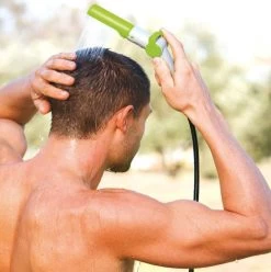 Voor kampeerders is de Aqua2go de ideale reispartner. Niet alleen uw uitrusting reinigt u in een handomdraai, u kunt de drukreiniger ook als frisse douche gebruiken.