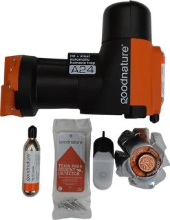 De Goodnature A24 rattenval en muizenval doodt automatisch 24 ratten of muizen -de een na de ander, zonder dat u het CO2 patroon tussentijds moet vervangen. Het maakt gebruik van niet-giftige lokstof en doodt ongedierte op een humane manier.