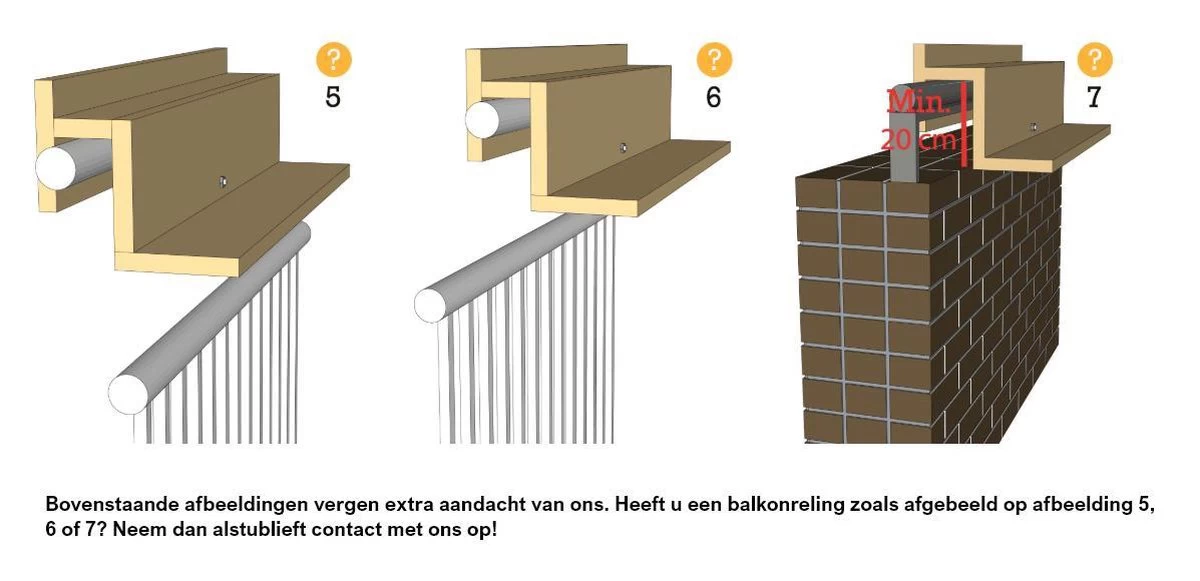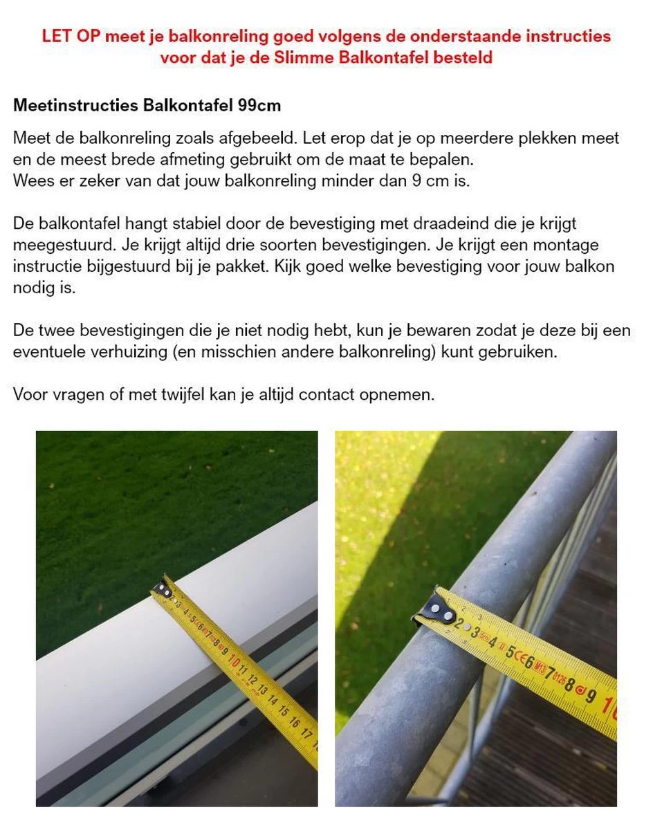 Lees nogmaals de meetinstructie op de afbeeldingen. Kom je er niet uit of heb je een vraag? Mail ons gerust een foto van je balkonreling en wij kijken met je mee!