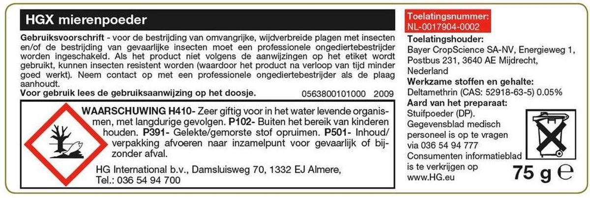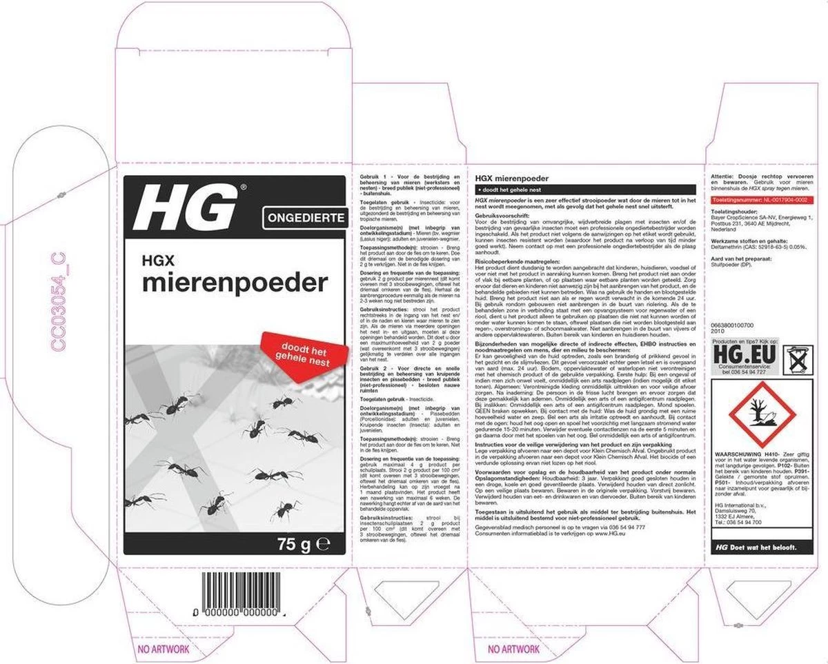 De HGX mierenpoeder is een zeer effectief strooipoeder tegen mieren voor buitenshuis. Het werkt al binnen 1 uur en bestrijdt het gehele nest, waardoor mieren niet snel meer terugkomen. De HGX mierenpoeder werk zeer snel. Doordat mieren het mee terugnemen naar het nest, doet het ook daar zijn werk. Strooi de aangegeven dosering mierenpoeder in de nestingangen en in de naden en kieren waar de mieren lopen. Het poeder doet daarna het werk.
