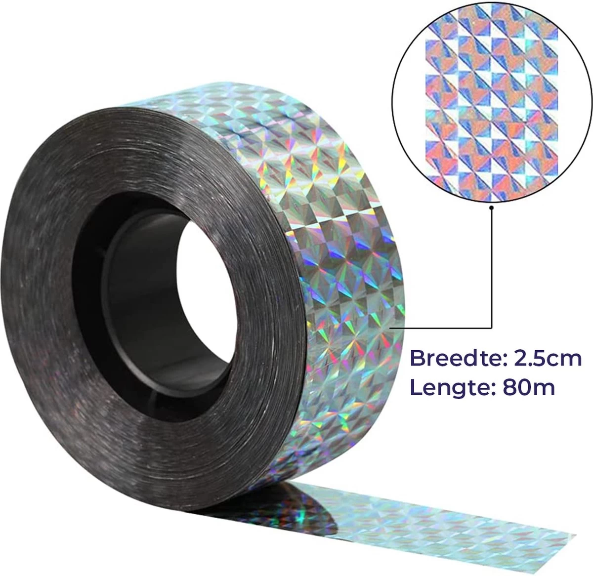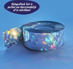 Met dit lint heb je de meest ideale en diervriendelijke manier van verjagen in huis! Dit lint reflecteert namelijk enorm door de holografische print. Door een beetje wind beweegt het lint waardoor het wapperen ook geluid maakt. Mooi dus om te zien maar vooral efficiënt! Gebruik het overal: op het balkon, in de tuin of bij de vijver tegen reigers. Een mooi alternatief voor duivenpinnen, een vogelnet of een vogelverschrikker.