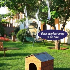 Tip: het beste kun het lint in kleinere stukken knippen en los hangen voor het balkon, in de tuin of tussen de fruitbomen. Dan beweegt het lint namelijk sneller door de wind en maakt het ook nog meer geluid om vogels extra af te schrikken.