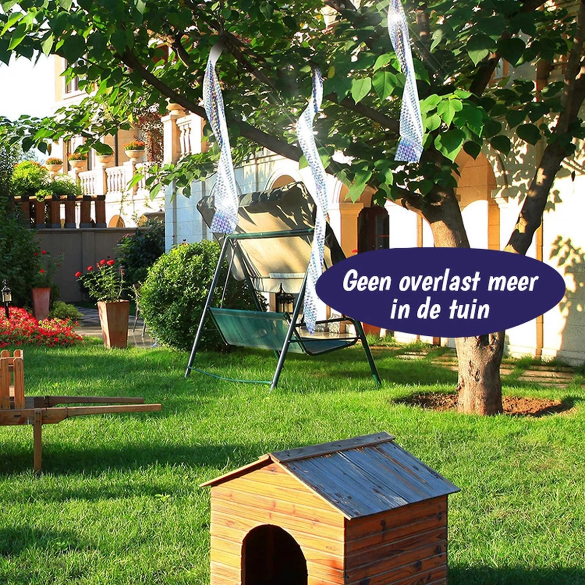 Ongewenste vogels op het balkon, in de tuin of tussen de gewassen en het fruit kan een grote plaag zijn. Ze kunnen veel lawaai maken, eten o.a. (fruit)bomen leeg én ze laten een hoop poep achter. De ergernissen worden steeds groter. Gelukkig hebben wij de oplossing! Vogels zijn namelijk gevoelig voor reflecterend licht, bewegingen én geluid. Deze drie factoren vormen dit product. Hang het lint dus liever niet te strak zodat het meer kan bewegen.