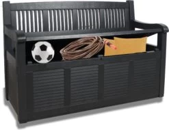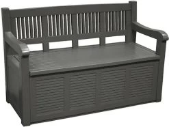 Mooie en ruime opbergbank Salzburg, gemaakt van bijzonder duurzame en weersbestendige kunststof. Onder het zitvlak zit een opbergruimte met een inhoud van 280 liter die ideaal is voor het opbergen van kussens, speelgoed of tuingereedschap. De bank heeft een lengte van 130cm en een breedte van 60cm. De totale hoogte is 85cm. Door het handige insteeksysteem is montage erg eenvoudig en is de bank in een mum van tijd in elkaar gezet. De bank is antractiet van kleur en is, door zijn weersbestendige kunststof, vrijwel geheel onderhoudsvrij.