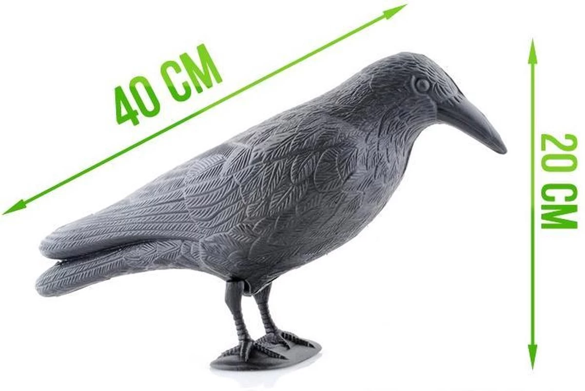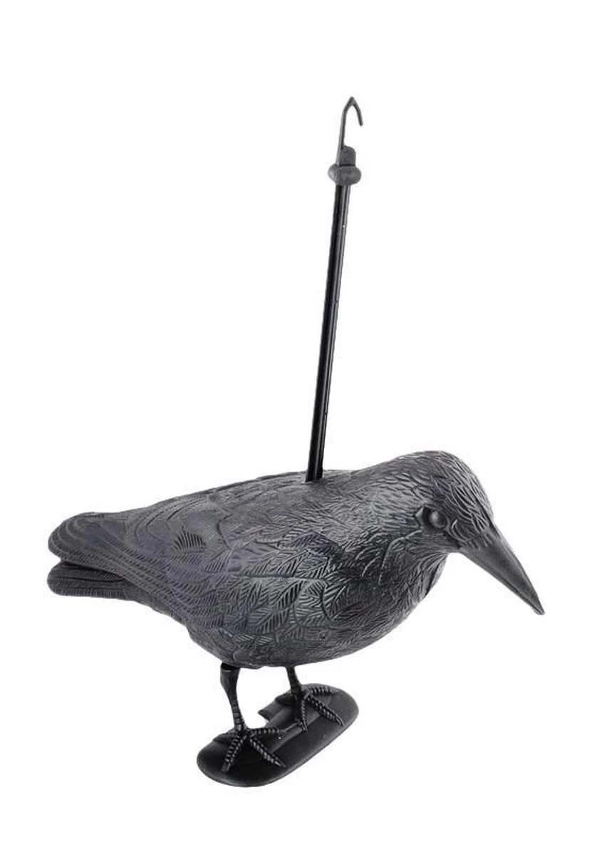 Deze levensechter vogelverschrikker kraai is de meest vreedzame, diervriendelijke en decoratieve manier om verlost te worden van duiven, ekster (enz) die je balkon of terras bevuilen. De kraai is weerbestendig en kan zowel staand geplaatst worden als worden opgehangen. Ook zeer geschikt ter decoratie van uw tuin of balkon,… en feest decoratie (Halloween)