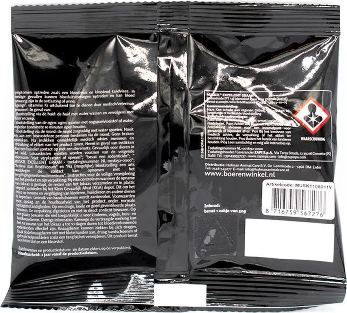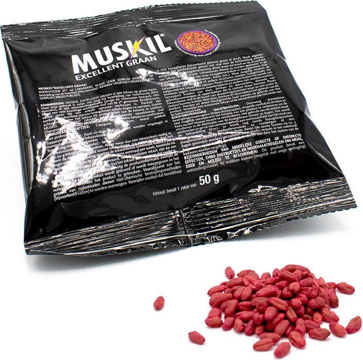 Muskil Excellent Graan is een kant en klare lokaas op graanbasis klaar voor gebruik in sachets van 50 gram. Werkt reeds na een enkele opname. Knaagdieren sterven enkele dagen na opname, zonder achterdocht tegen het lokaas bij andere leden van de kolonie te wekken.