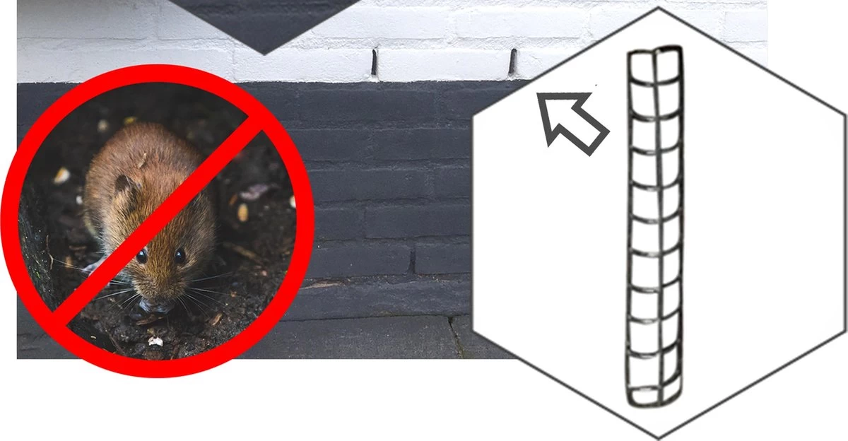 - Als de voeg niet volledig wordt opgevuld met een rooster dan kan er toch ongedierte naar binnen. Let op een muis heeft maar 0,5 – 1 cm nodig om binnen te komen en wespen – bijen – hommels nog minder