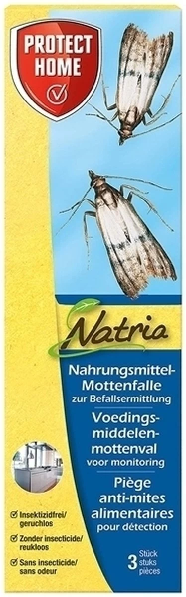 - Gebruiksklaar, insectenvrije, geurloze lijmval met kleefoppervlak en feromonlokstof ter bestrijding van voedselmotten.