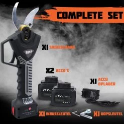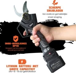 De elektrische snoeischaar is gemaakt van kwalitatief hoogwaardig materiaal en de snijbladen zijn gemaakt van carbon materiaal. Daarnaast zijn de snijbladen ontworpen in de vorm van een papegaaienbek, waardoor het moeiteloos en snel takken kan snoeien met een totale dikte van maar liefst 40 millimeter. De in combinatie met de krachtige 21V 2.0 Ah accu maken het mogelijk om binnen no-time iedere klus te klaren.
