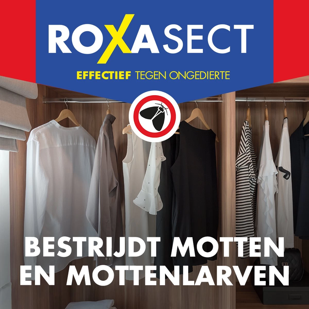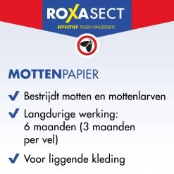 Ben jij helemaal klaar met al die motten in je kledingkasten en die gaatjes in jouw mooie kleding en dekens? Roxasect mottenpapier houdt jouw kledingkast zes maanden mottenvrij. Het papier bestrijdt motten en mottenlarven effectief. De voordelen van Roxasect Mottenpapier: – Bestrijdt motten effectief – Voor liggende kleding – Werking: 6 maanden