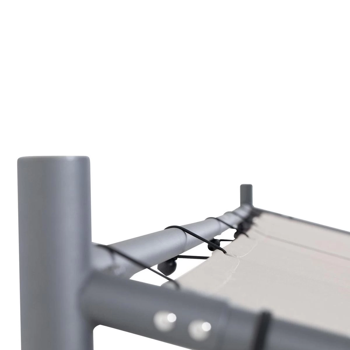 Specificaties• Afmeting: 282 x 214 x 285 x 400 (HxHxLxB). De hoogte is gebaseerd op de hoogte van de palen, het doek is bevestigd op ongeveer 10 cm onder de aangegeven hoogte, zie afbeelding.• Materiaal doek: 250 grams polyester• Materiaal frame: Staal met donkergrijze poedercoating