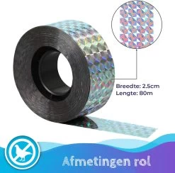 Met dit lint heb je de meest ideale en diervriendelijke manier van verjagen in huis! Dit lint reflecteert namelijk enorm door de holografische print. Door een beetje wind beweegt het lint waardoor het wapperen ook geluid maakt. Mooi dus om te zien maar vooral efficiënt! Gebruik het overal: op het balkon, in de tuin of bij de vijver tegen reigers. Een mooi alternatief voor duivenpinnen, een vogelnet of een vogelverschrikker.
