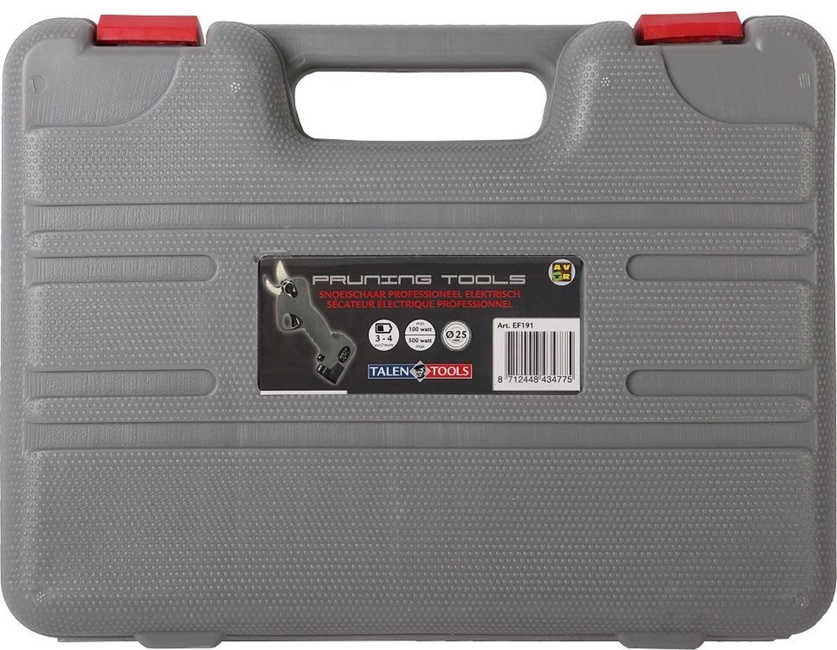 Wil je pijnloos snoeien zonder je handen te belasten? Dan is de Talen Tools accu snoeischaar de oplossing. Het lichte gewicht en ergonomisch ontworpt zorgt ervoor dat je gemakkelijk kan snoeien zonder dat je pijn aan je handen krijgt. Met slechts één druk op de knop hoef jij je nooit meer zorgen te maken over dikke takken die je met de hand moet snoeien. Geniet van pijnloos snoeien met deze Talen Tools accu snoeischaar. De snoeischaar snoeit takken tot 25mm dik en heeft een accuduur van 3 – 4 uur.
