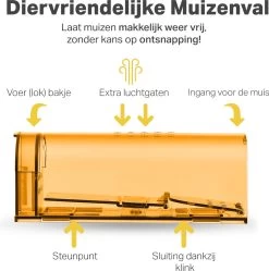 Last van muizen in je huis of tuin maar vind je de traditionele muizenval te wreed of onveilig? Dan is deze diervriendelijke muizenval wat jij zoekt! De muizenval is voorzien van een deurtje die dicht zal gaan als de muis het aas bereikt, waardoor de muis geen pijn zal krijgen. Het vrijlaten van de muis gebeurt eenvoudig en hygiënisch, je hoeft de muis namelijk niet aan te raken.