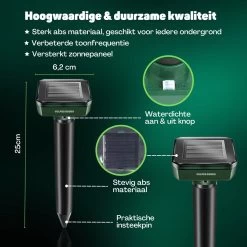 De mollenverjager van Vulpes Goods® zorgt er dankzij ultrasonisch geluid voor, dat de mollen er niet aan denken om in je tuin te komen of als ze er al zijn zo snel mogelijk te verdwijnen! Dit geluid is voor mensen nauwelijks te horen, maar voor mollen is dit geen fijn geluid net zoals de bijkomende vibraties, waardoor ze weg zullen blijven uit jouw tuin!