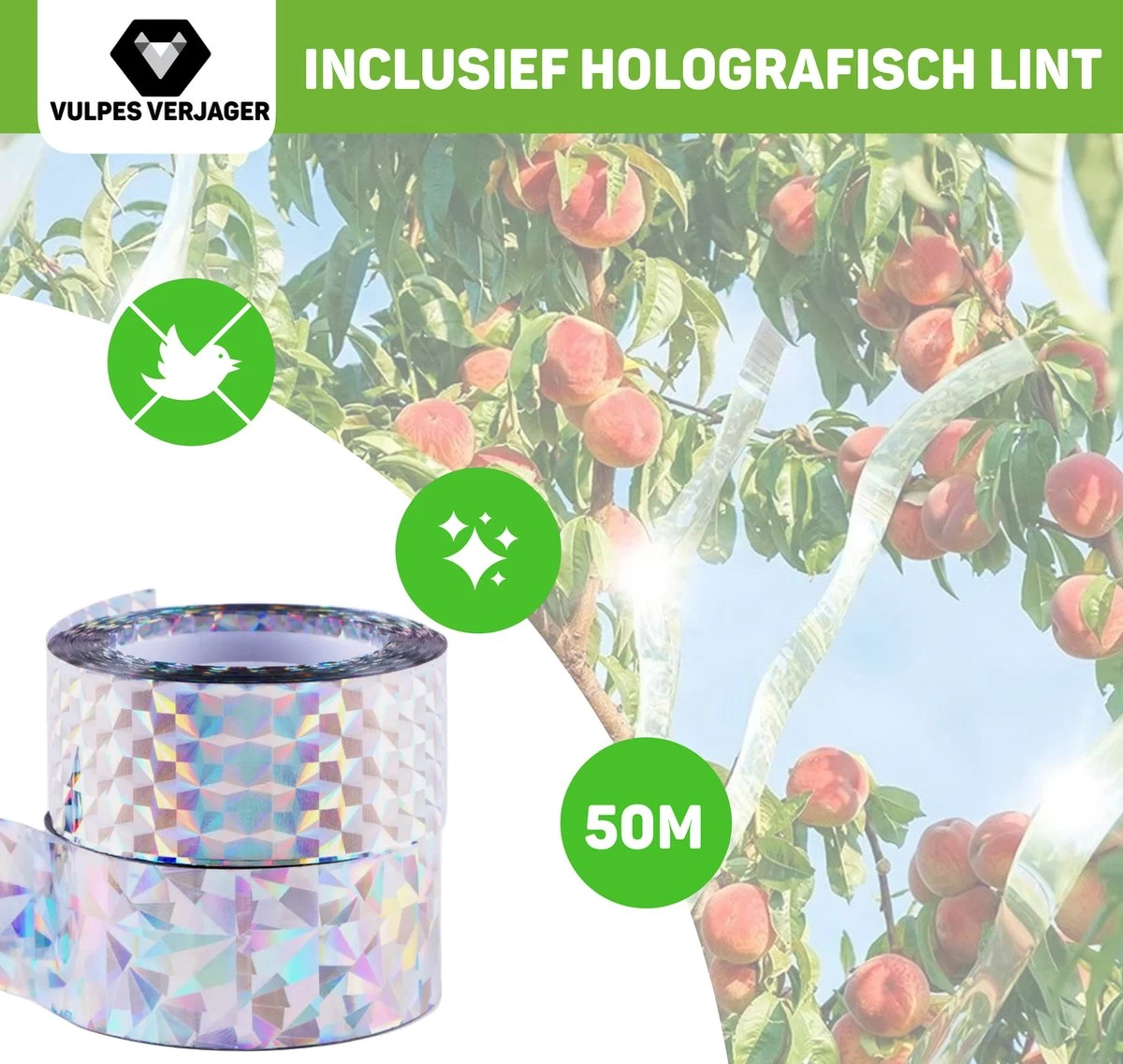 Bij bestelling van de verjager krijg je er een holografisch lint bij, die de duiven en vogels ook zal afschrikken. De vogels kunnen namelijk niet tegen de felle flitsen, hier schrikken ze van. Het lint is overigens niet verblindend! Het lint is 50 meter lang, zodat je meer dan genoeg hebt om meerdere plekken er van te voorzien!