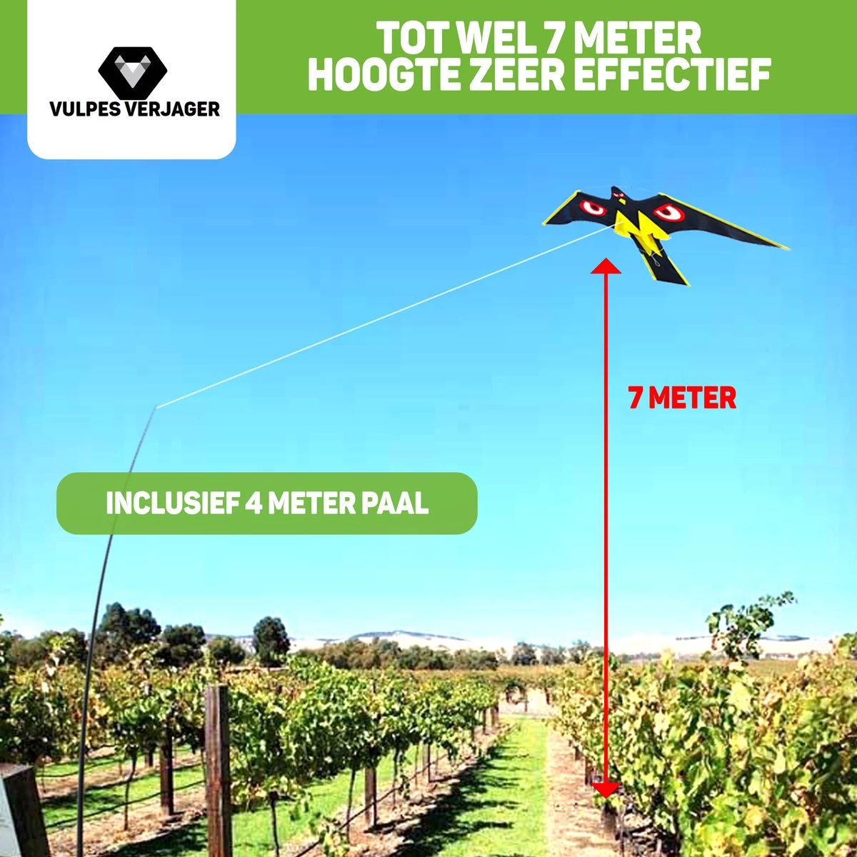 Het telescopische design van de verjager zorgt ervoor dat je hem gemakkelijk kunt uitschuiven en via de bijgeleverde pin eenvoudig in de grond kunt steken. Door het telescopische ontwerp kun je de verjager makkelijk opbergen, zodat het niet te veel ruimte in beslag neemt. De telescoop is 4 meter lang. Daarnaast is onze Vulpes Verjager van duurzame kwaliteit Nylon ten opzichte van overige Kite Hawks.