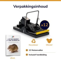 Deze set bevat 12 muizenvallen met een 100% pakkans. De vallen hebben een simpel ontwerp en lijken op de traditionele muizenval. Echter heeft deze val een moderne upgrade, wat je terugziet in het stevige materiaal en ongekend gevoelige triggerplateau. De val klapt krachtig dicht, waardoor gevangen ongedierte met geen mogelijkheid meer loskomt. Deze muizenval is de beste koop wanneer je snel en efficiënt ongedierte wilt bestrijden.