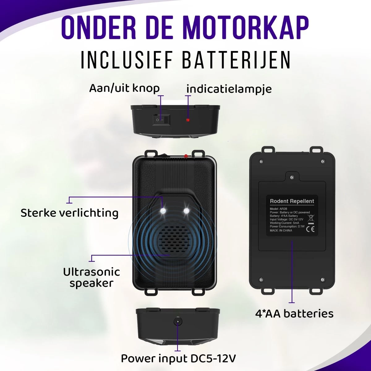 De marterverjager is makkelijk onder de motorkap te monteren en verjaagt door middel van verblindende lichten en ultrasone geluiden ongedierte rond je auto. De verjager heeft twee modussen: een die automatisch uitgaat bij het starten van de motor, en een stand die gedurende dag aan staat. Ook kan je de verjager gebruiken voor andere ruimtes zoals in een schuur of een garagebox. Je kunt het apparaat op wel drie manieren voorzien voor stroom. Dit zorgt ervoor dat hij gebruikt kan worden in elke situatie.